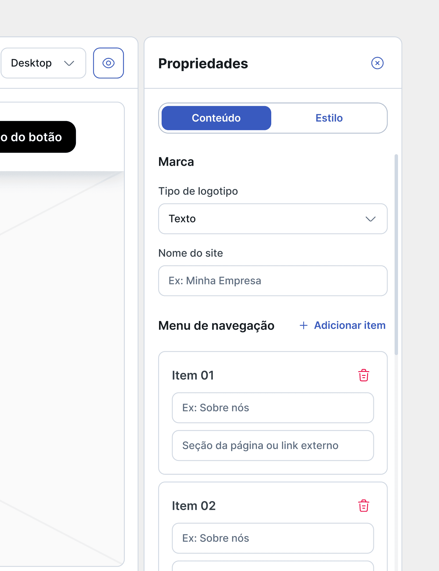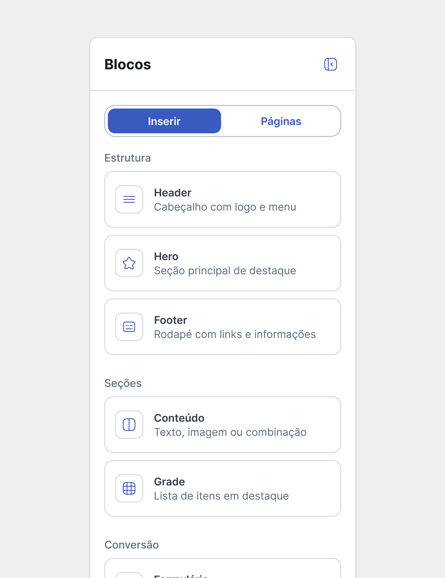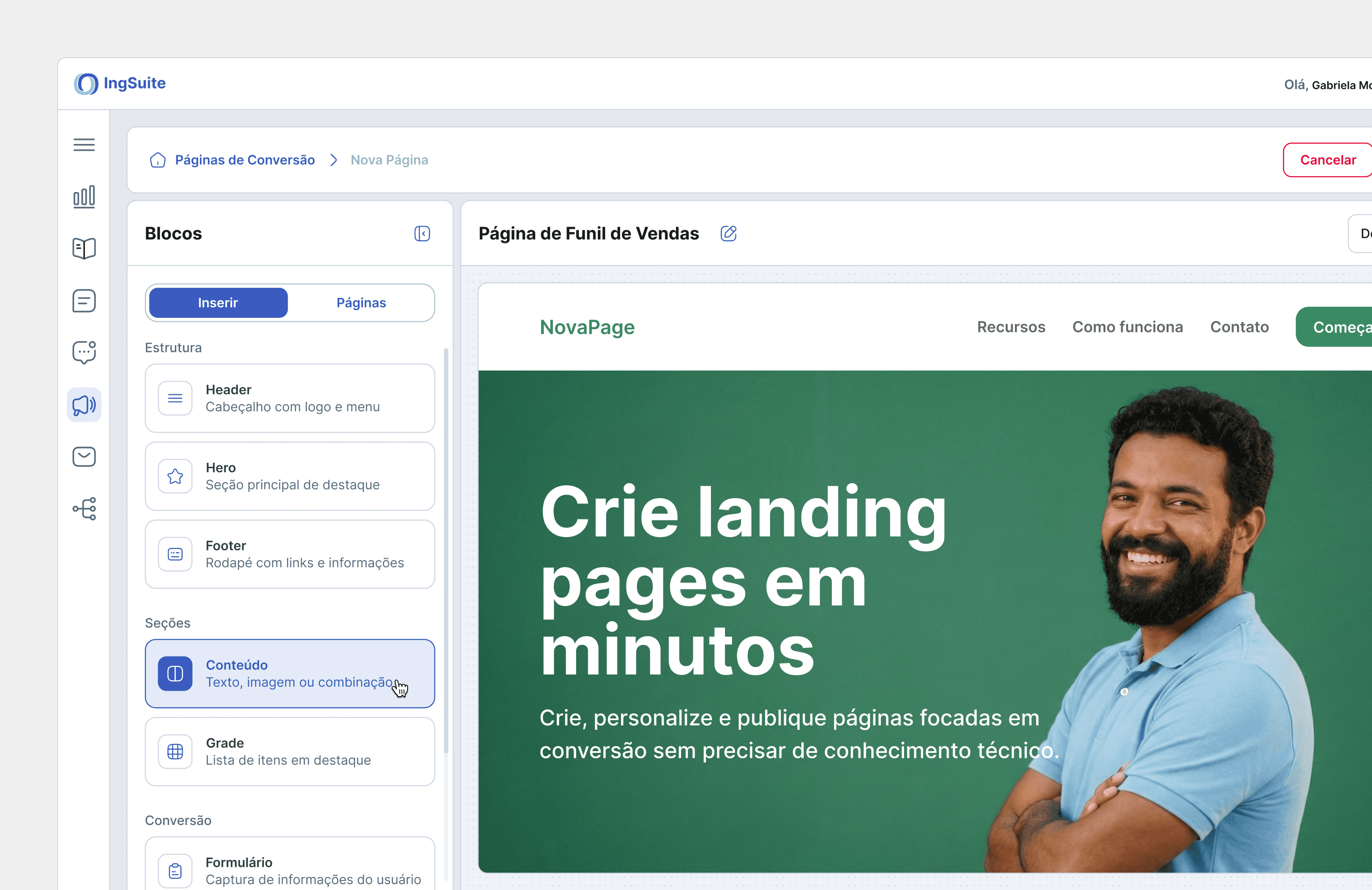 O design foi lapidado para ser funcional e "invisível". Em vez de um editor complexo com infinitas possibilidades, entregamos uma ferramenta baseada em componentes pré-configurados que reduzem a paralisia de escolha do usuário.